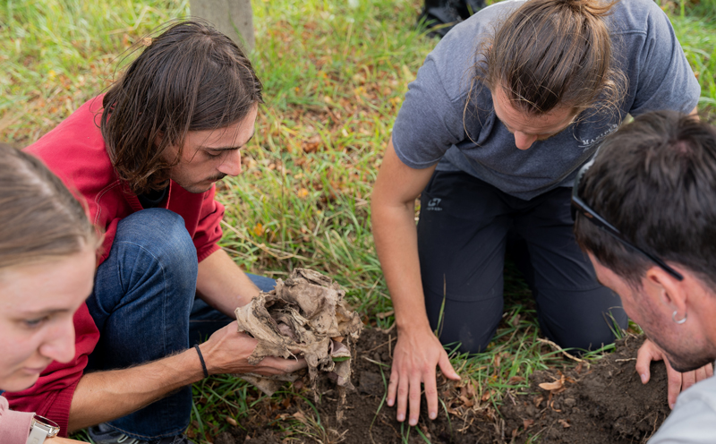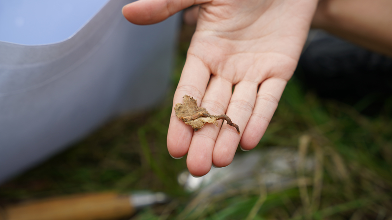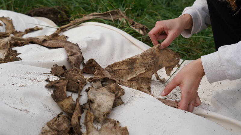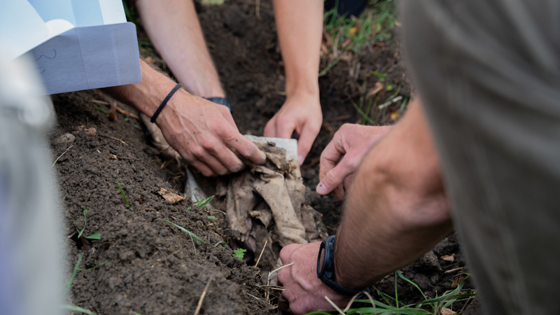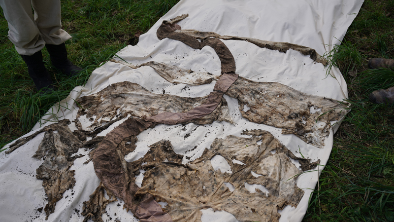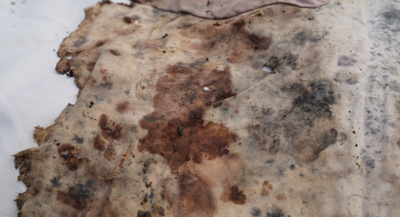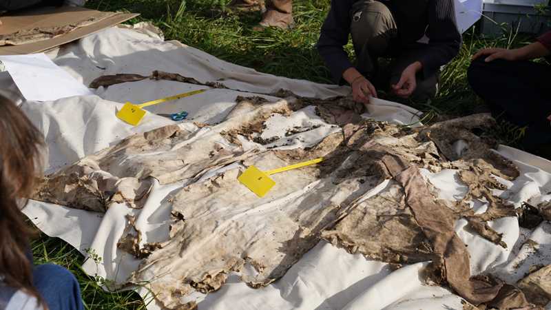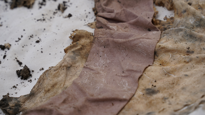 Dans le cadre du projet de recherche Faire commun, l’artiste Thierry Boutonnier a imaginé une méthode pour évaluer de manière sensible la qualité des sols du Parc Rigot. Il a organisé un pique-nique sur une longue nappe en coton biologique, qui a ensuite été découpée en morceaux et enterrée dans différentes zones du parc. Après quelques mois, la nappe a été déterrée, et la quantité de tissu consommé grâce à la bioactivité du sol a fourni des informations concrètes sur ses caractéristiques. Qu’avez-vous observé ?